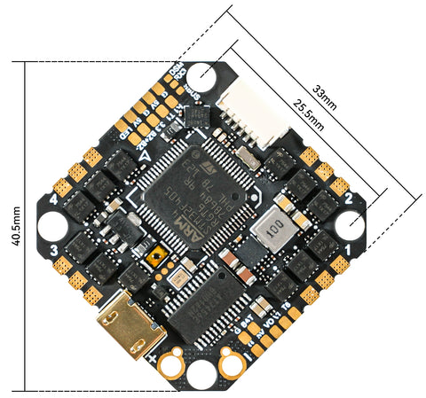 • The flight controller is capable of handling 20A continuous current and reaching 25A peak current due to high-quality MOSFETs.